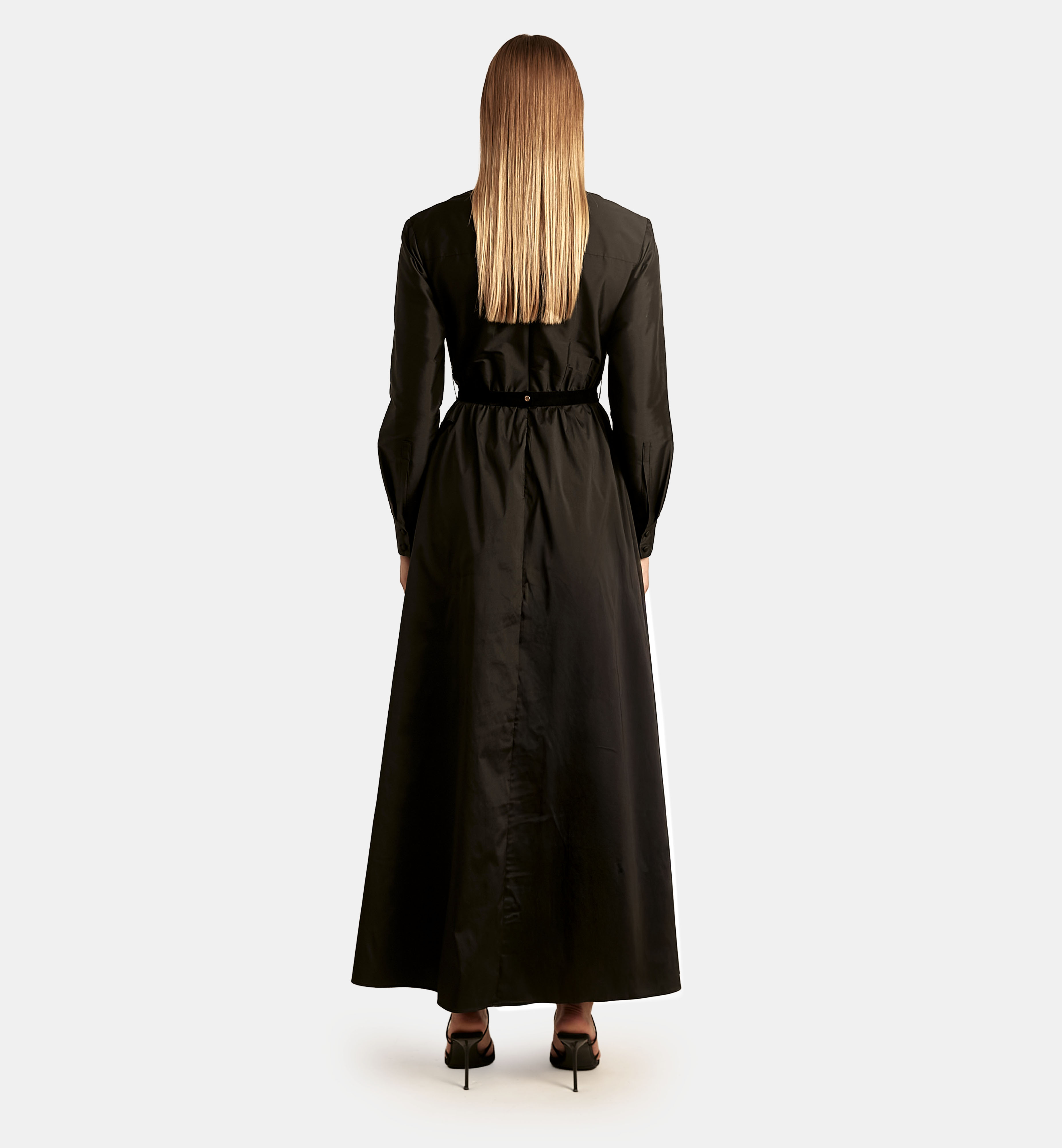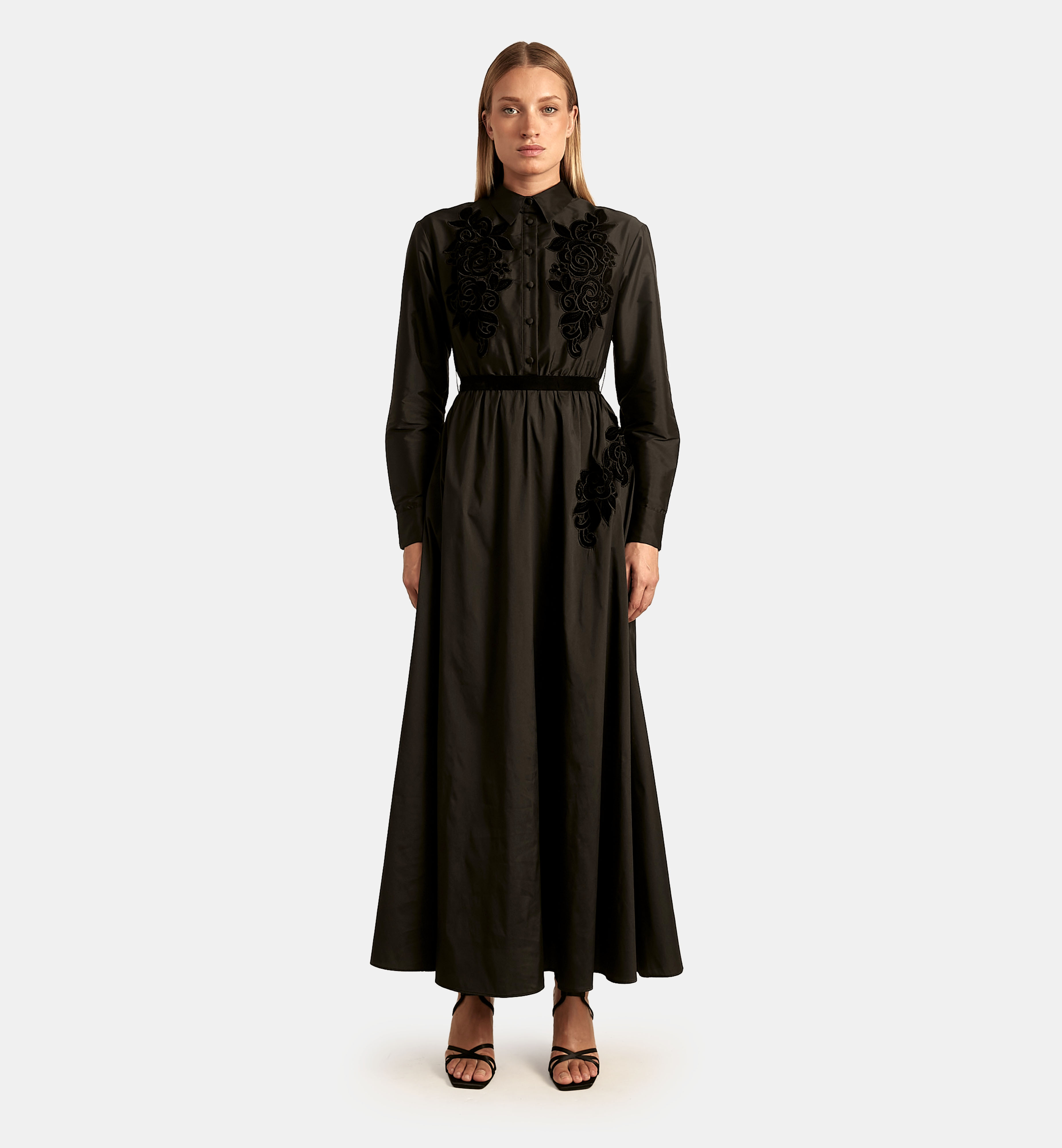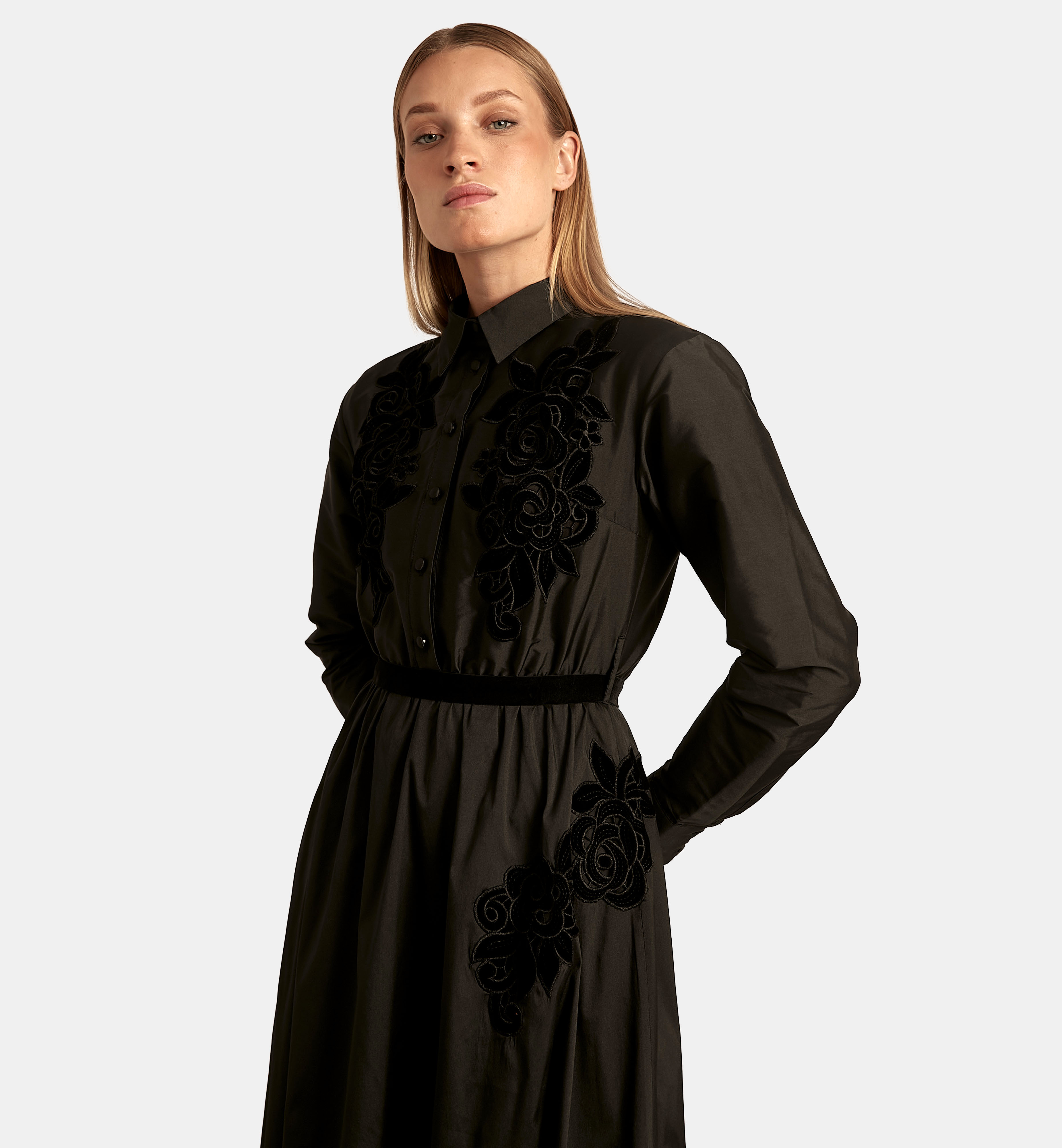 Buttoned Taffeta Dress with Velvet Flowers midi, Black