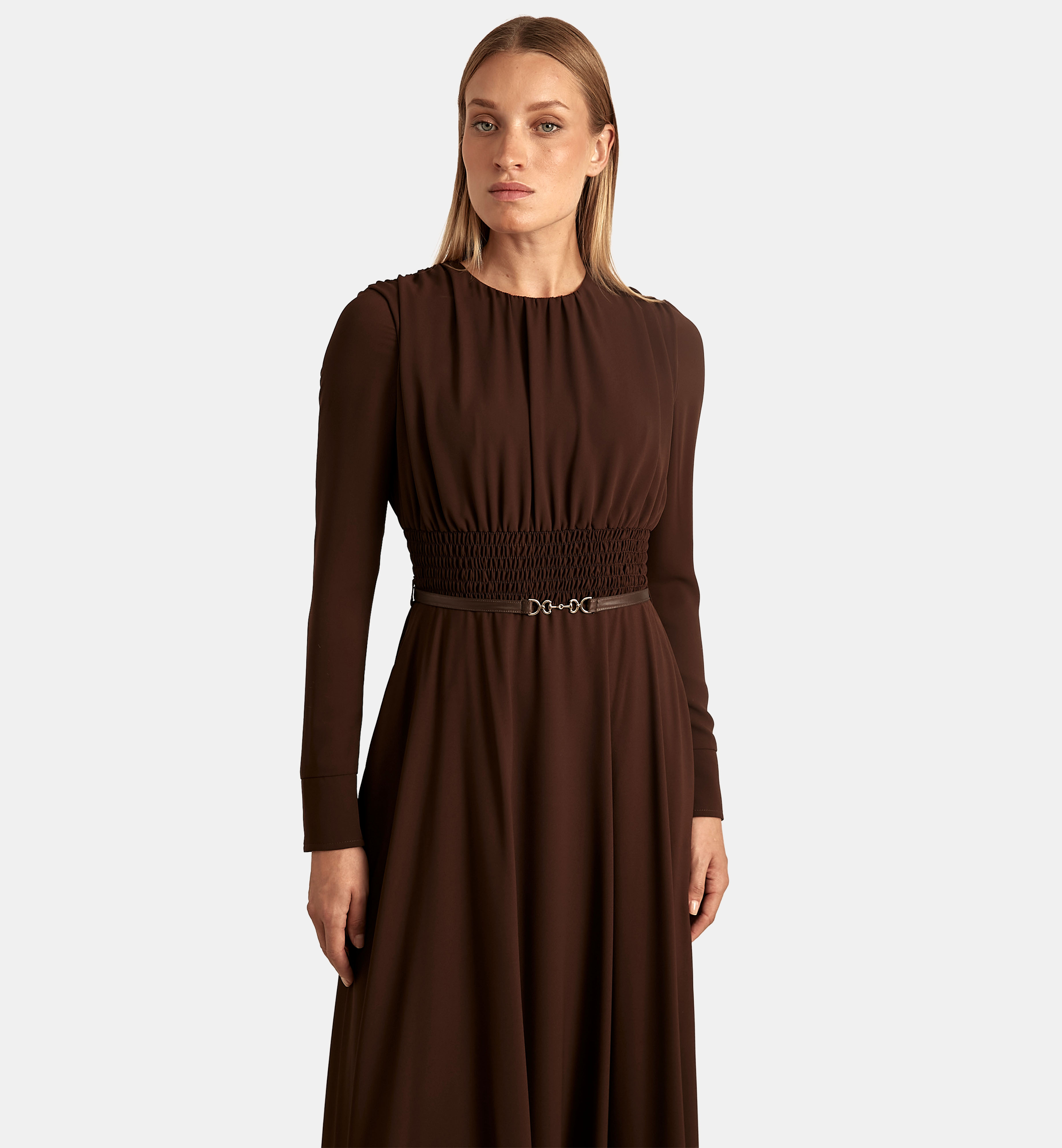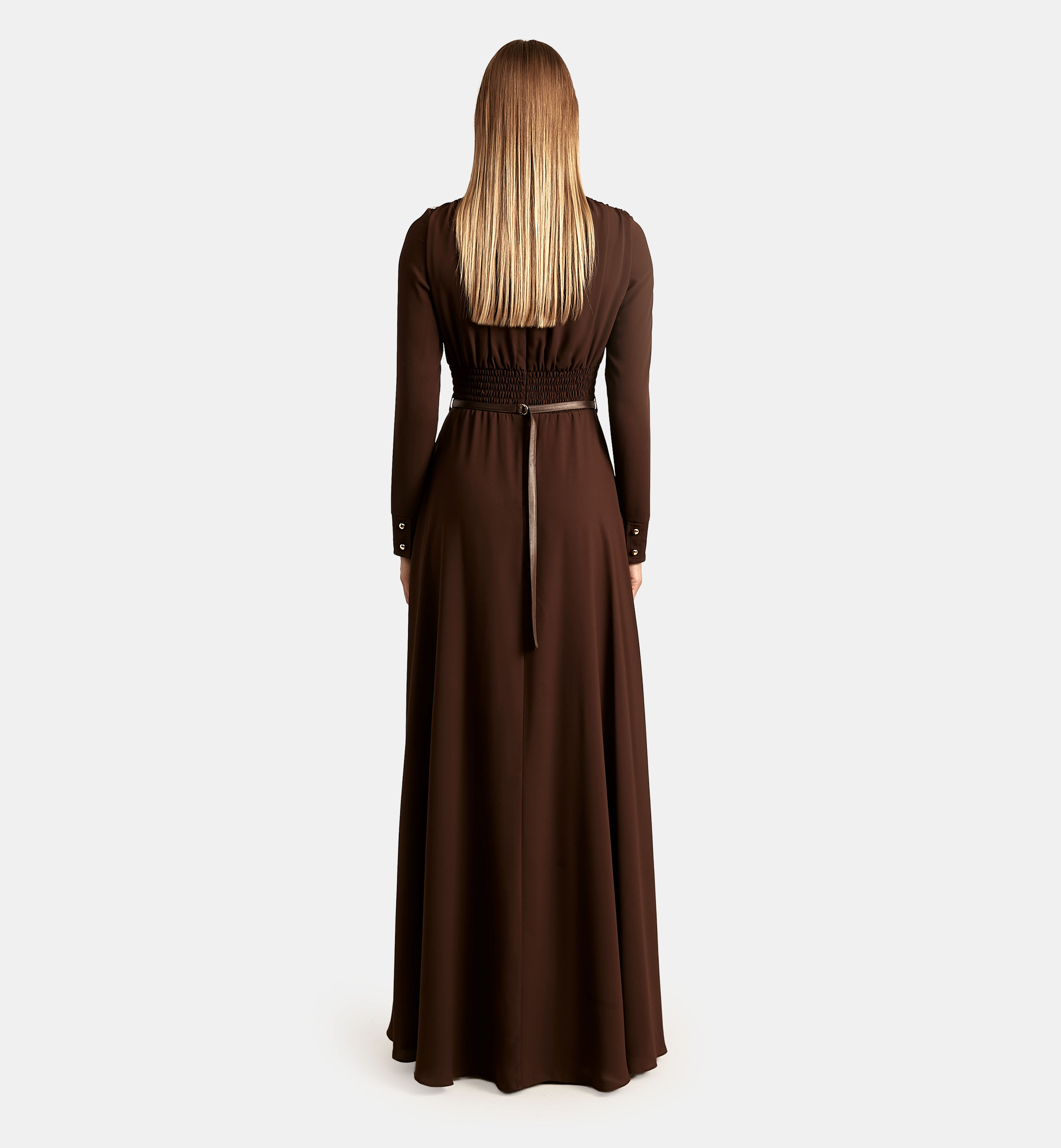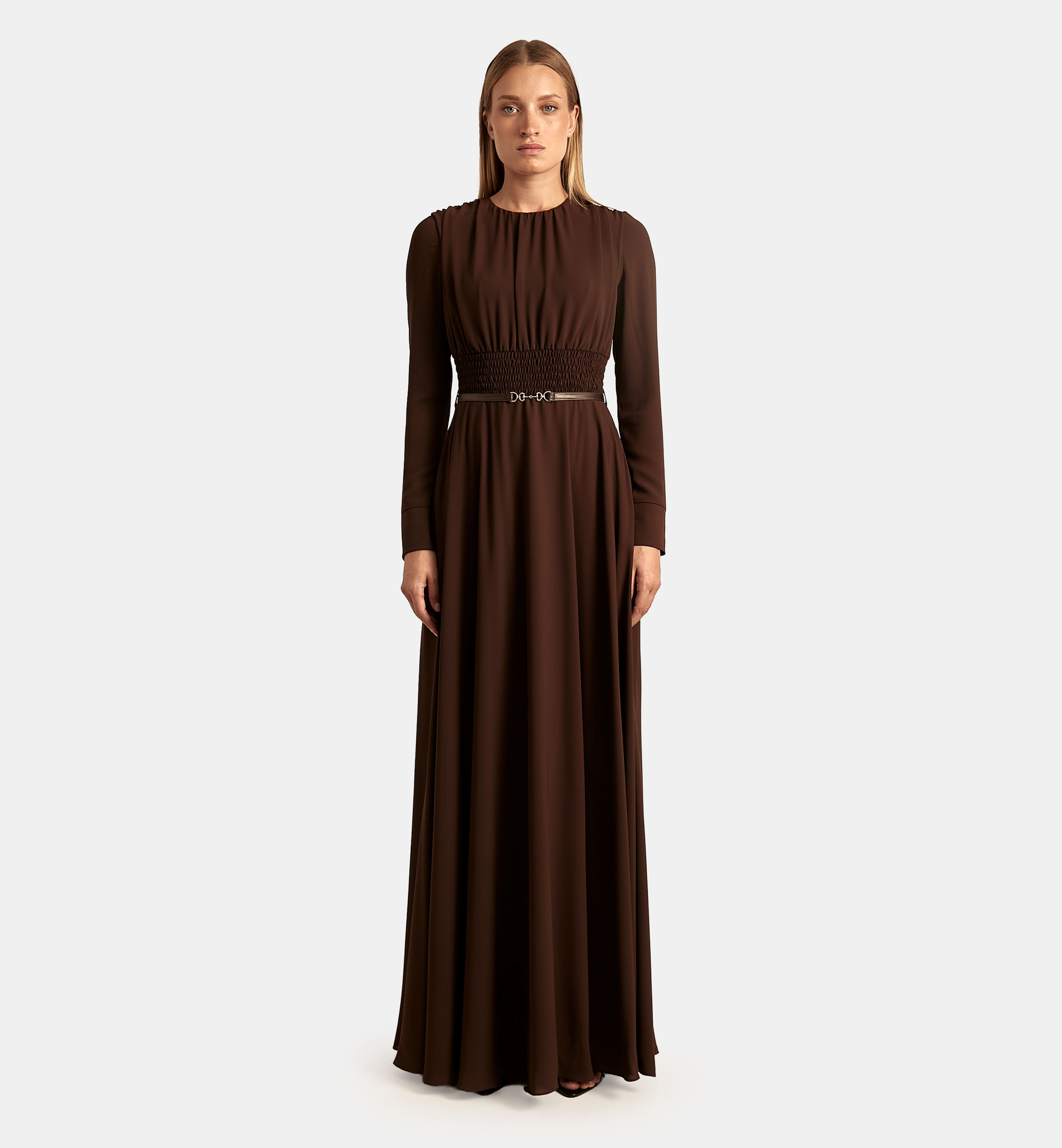 Chiffon Dress with Built-in Smocked Elastic Belt maxi, Brown