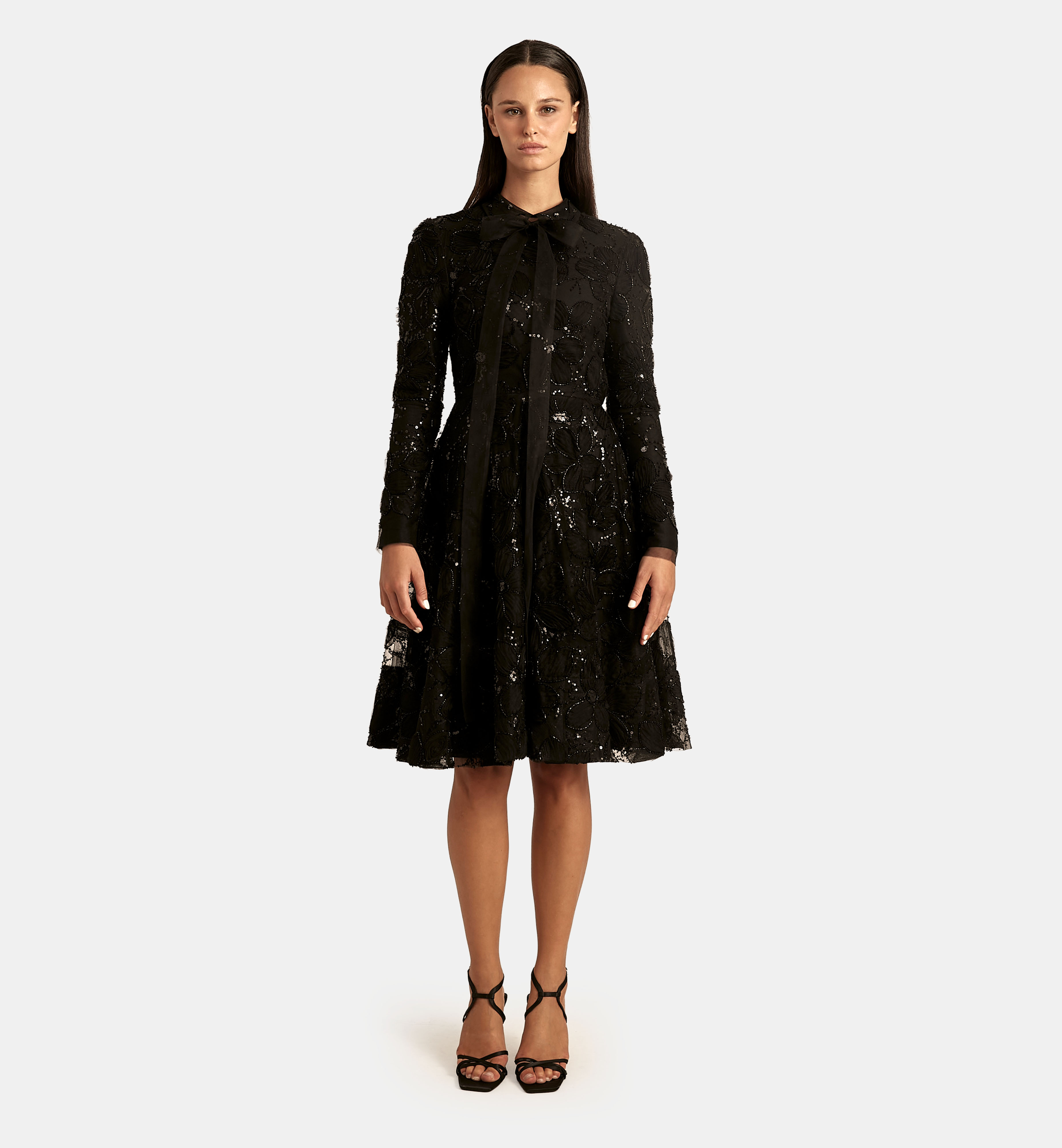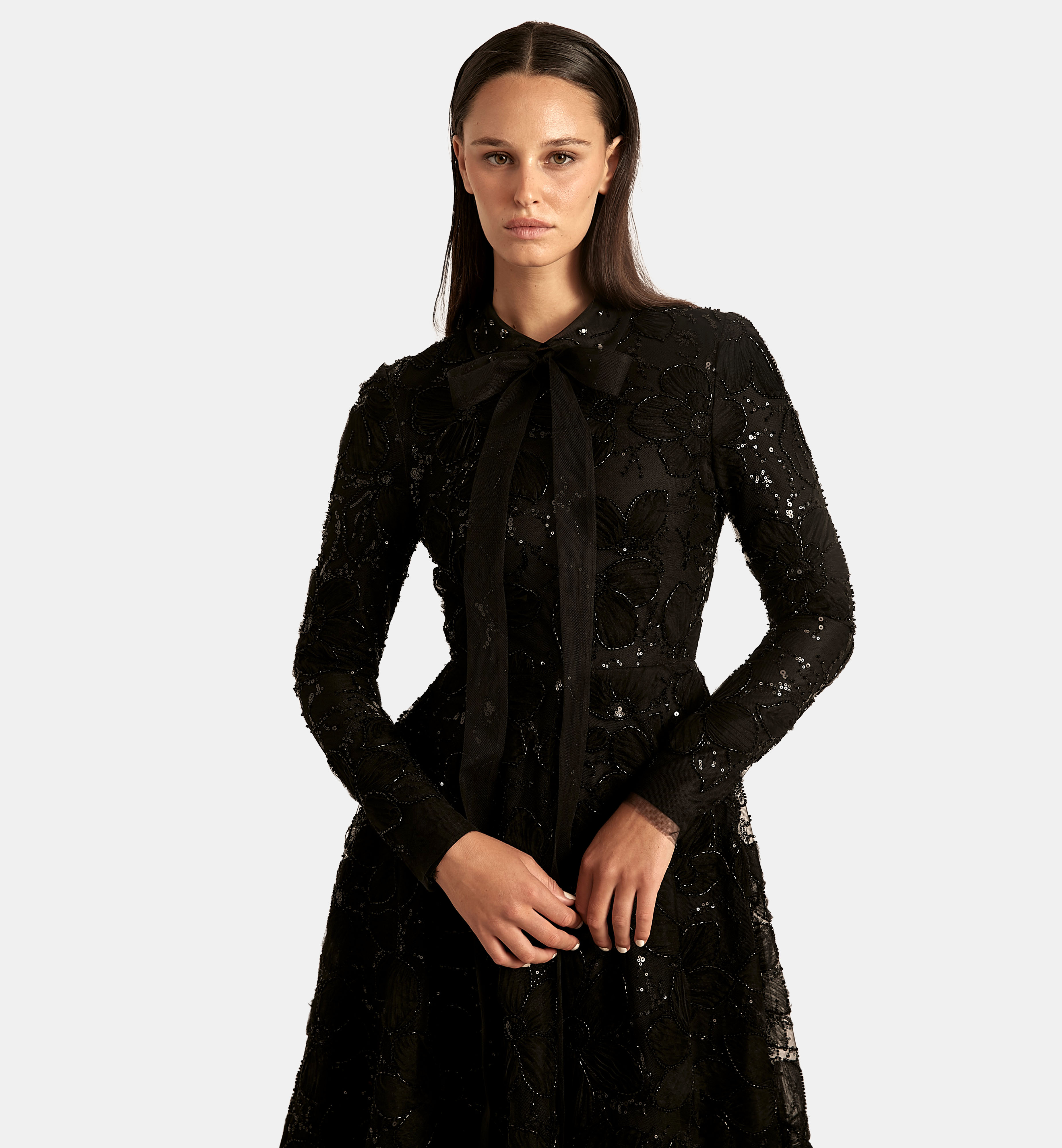 Tulle Dress with Floral Fabric Folds, Black