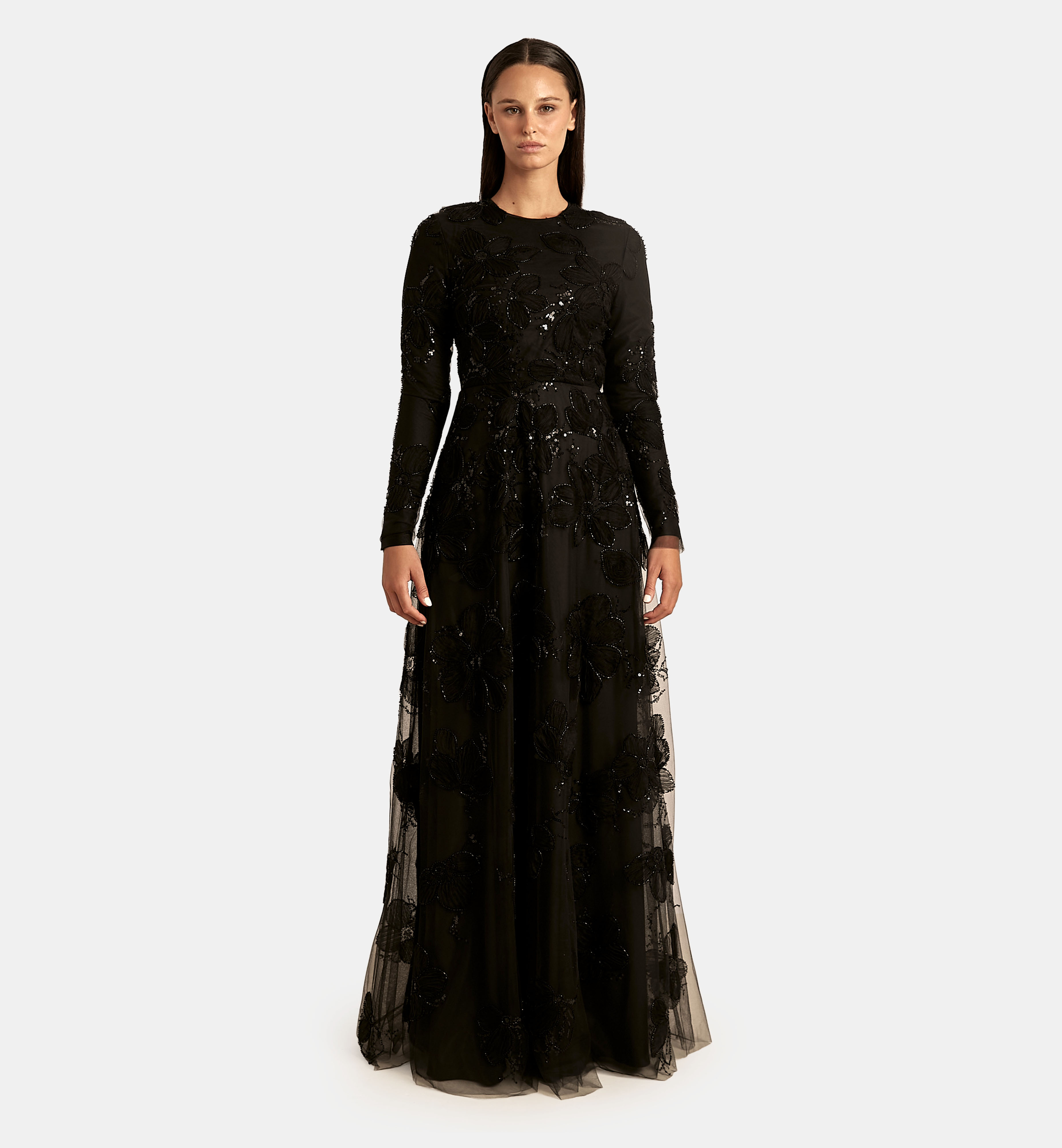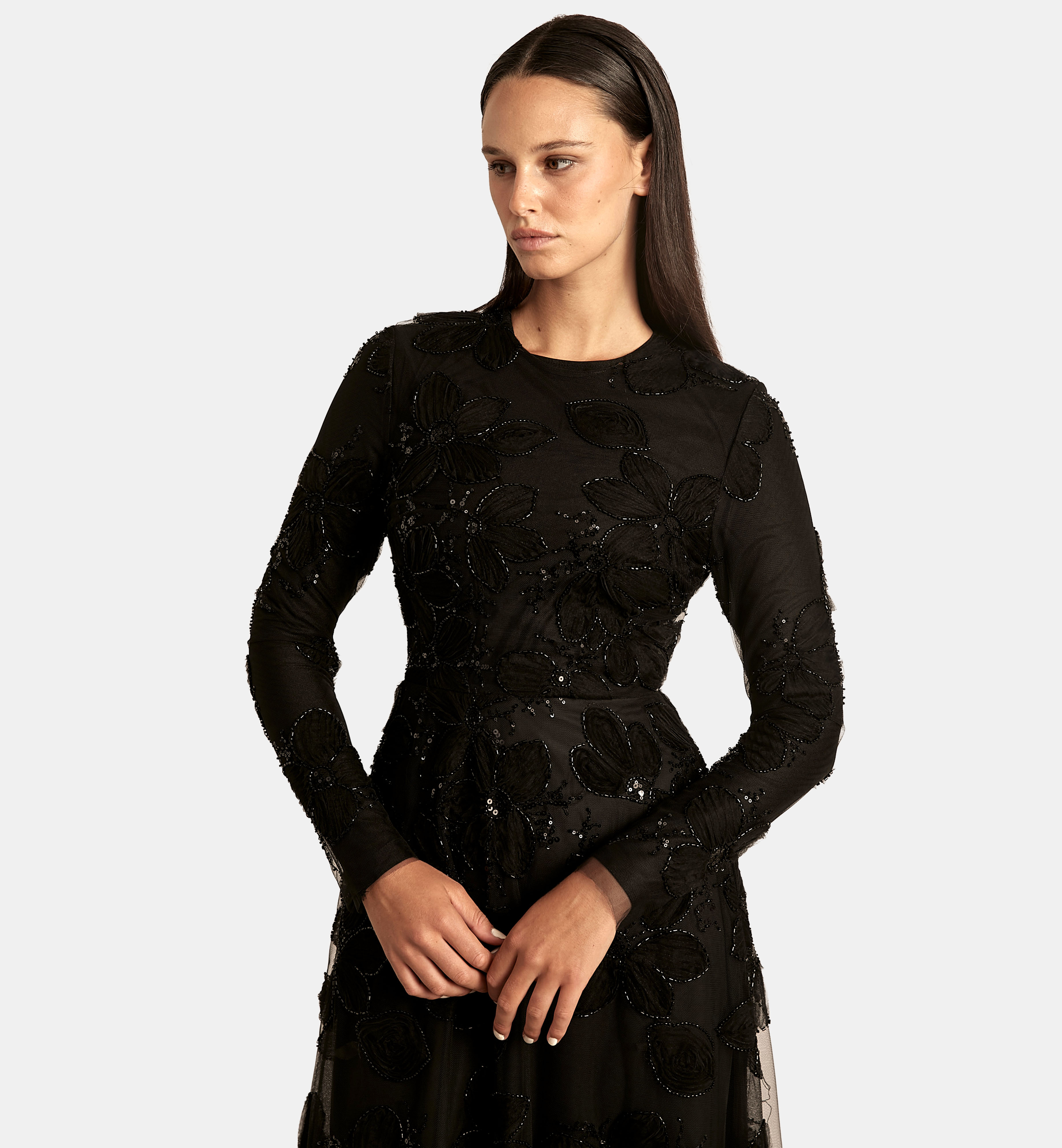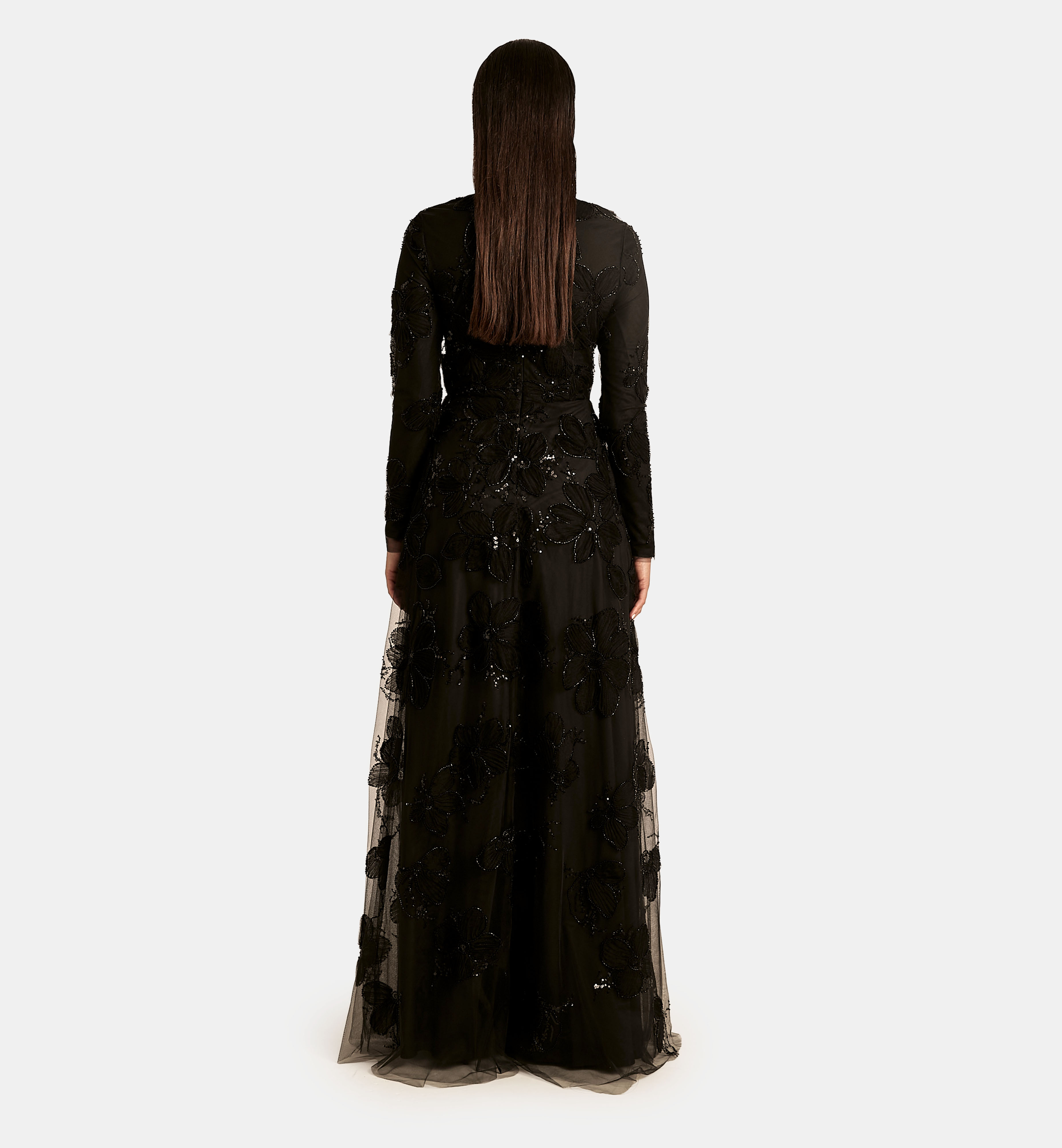 Tulle Dress with Floral Fabric Folds maxi, Black
